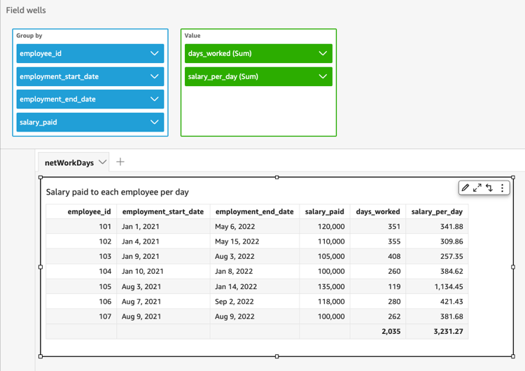 En el siguiente ejemplo se calcula el número de días trabajados por cada empleado y el salario empleado por día para cada empleado: