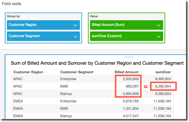 sumOver ( sum({Billed Amount}), [{Customer Region}] )