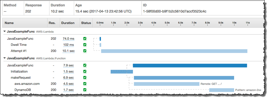 New XRay Service Graph Start time: 2025-02-03 14:31:48+01:00 End time: 2025-02-03 14:31:48+01:00 Reference Id: 0 - (Root) AWS::Lambda - sam-app-HelloWorldFunction-y9Iu1FLJJBGD - Edges: [] Summary_statistics: - total requests: 1 - ok count(2XX): 1 - error count(4XX): 0 - fault count(5XX): 0 - total response time: 5.587 Reference Id: 1 - client - sam-app-HelloWorldFunction-y9Iu1FLJJBGD - Edges: [0] Summary_statistics: - total requests: 0 - ok count(2XX): 0 - error count(4XX): 0 - fault count(5XX): 0 - total response time: 0 XRay Event [revision 3] at (2025-02-03T14:31:48.500000) with id (1-63dd0cc4-3c869dec72a586875da39777) and duration (5.603s) - 5.587s - sam-app-HelloWorldFunction-y9Iu1FLJJBGD [HTTP: 200] - 4.053s - sam-app-HelloWorldFunction-y9Iu1FLJJBGD - 1.181s - Initialization - 4.037s - Invocation - 1.981s - ## handleRequest - 1.840s - ## getPageContents - 0.000s - Overhead -