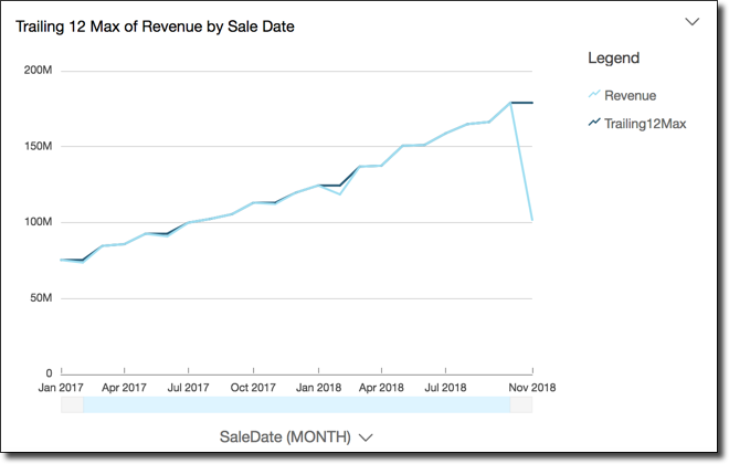 A captura de tela a seguir mostra os resultados desse exemplo dos últimos 12 meses. O campo sum(Revenue) é adicionado ao gráfico para mostrar a diferença entre a receita e a receita máxima dos últimos 12 meses.